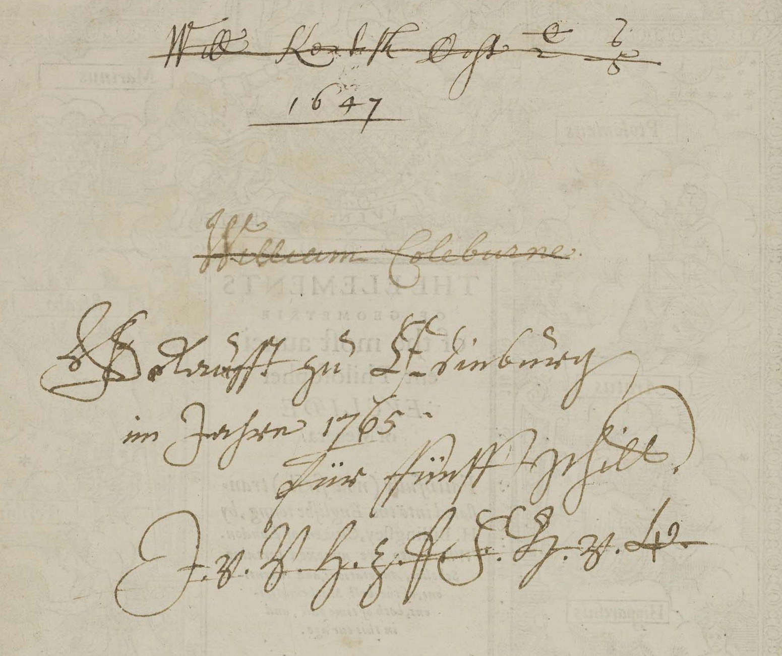 Above the bookplates, someone has written: “This book I bought of Mr. Robert Anderson December 1698 I gave [illegible] for it.” The name Robert Anderson is hardly uncommon, so we cannot identify this person with certainty. However, there is a somewhat obscure mathematician of this name, whose exact dates are not known. According to the Oxford Dictionary of National Biography, the mathematician Robert Anderson was active between 1666 and 1696. He was described by one of his contemporary mathematicians, John Collins, as “very able in algebra and solid geometry.” He published a book called Stereometrical Propositions (1668) and another called The Genuine Use and Effects of the Gunne as Well Experimentally as Mathematically Demonstrated (1674). Finally, there is a name we can’t make out with the date 1647.