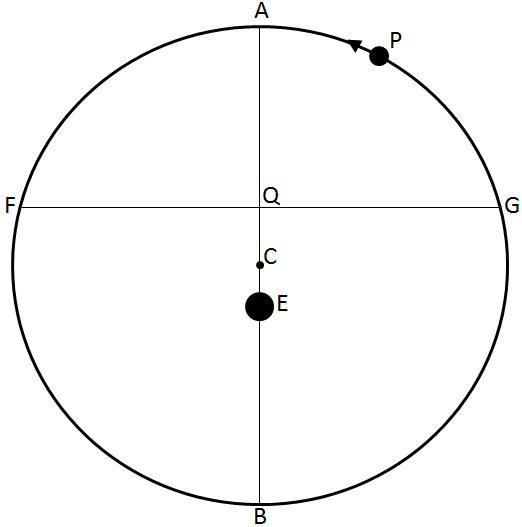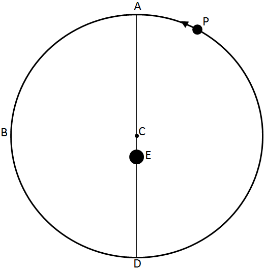 The first mathematical device was the eccentric. In the eccentric model, the planet moves with uniform circular motion, but this motion is not centered on the earth. Instead, the earth is offset from the center of the circle by some distance – called the eccentricity. In the diagram on the left, C is the center of the circle and E is the earth. The distance between C and the center of E is the eccentricity. Although the planet is moving with uniform circular motion, because the earth is not at the center of this rotation, to an observer on earth the planet appears to move with varying speed. This was an important model because no celestial body (except the stars) was observed to move around the earth uniformly. The sun, moon and planets all appeared to move faster at some times and slower at others.