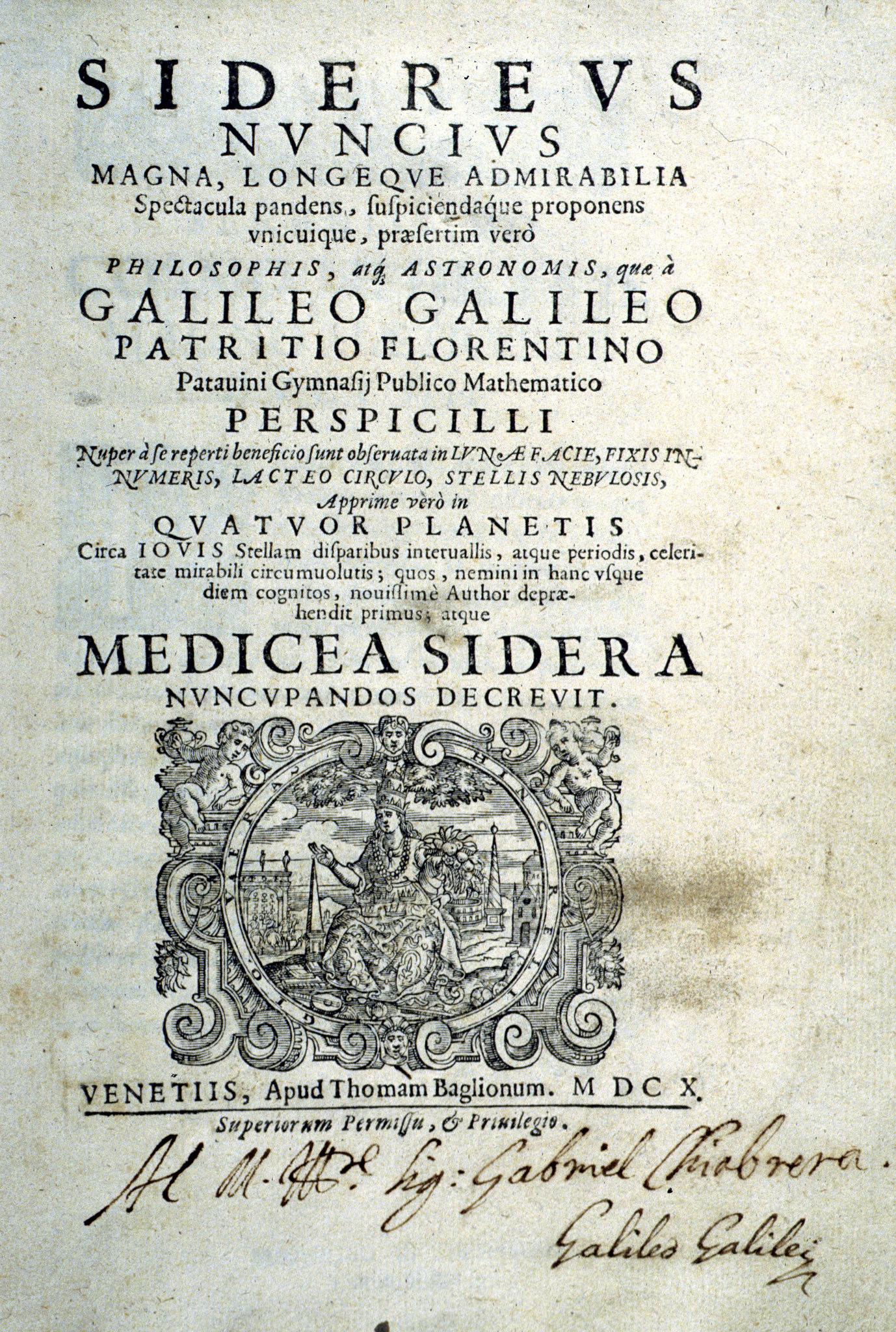 In the early seventeenth century, the Italian mathematician and astronomer Galileo Galilei (1564 – 1642) made some remarkable observations of the heavens that cast serious doubt on the validity of the Aristotelian/Ptolemaic view of the cosmos. Galileo was one of the very first people to observe the heavens through a telescope. In 1609, Galileo heard reports of an optical device that could magnify distant objects, a device most likely invented by the Dutch spectacle-maker Hans Lipperhey. Based on these reports, and his knowledge of optics, Galileo constructed his own telescope, and in 1609 began making observations of the heavens. (He was not the very first person to do this. The English astronomer Thomas Harriot made observations of the moon through a telescope about four months earlier than Galileo.) Within the space of a few months, Galileo had made three startling discoveries with his telescope. He announced these discoveries in a book called The Starry Messenger, published in 1610. Galileo’s discoveries did NOT constitute proof that Copernicus was right and the sun really was in the center of the universe (and Galileo did not try to claim this in 1610), but they did raise serious challenges to the accepted view of the cosmos.