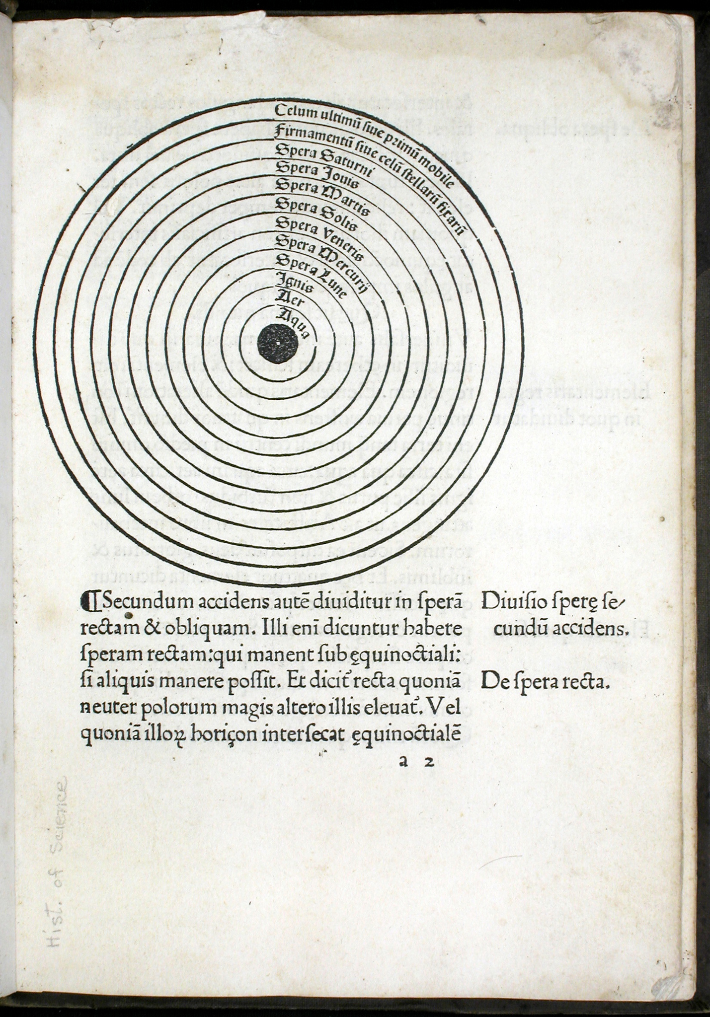 Here is a picture of the cosmos from the most widely used university astronomy textbook of the Middle Ages and early modern period, Johannes de Sacrobosco’s On the Sphere, composed in around 1230. (The image is from a later, printed version.) Note the concentric spheres of earth (the dark circle at the center), water (Aqua), air (Aer), fire (Ignis), then the sphere of the moon (Sphera Lune), the sphere of Mercury (Spera Mercurii), the sphere of Venus (Spera Veneris), the sphere of the sun (Spera Solis), the sphere of Mars (Spera Martis), the sphere of Jupiter (Spera Jovis), and the sphere of Saturn (Spera Saturni). Outside the sphere of Saturn is the “firmament or the heaven of the fioxed stars (Firmamentum sive celum stellarum fixarum). The outermost sphere is the “last heaven or the Prime Mover” (Celum ultimum sive primum mobile). For medieval university students and professors, the Prime Mover was generally identified as God.