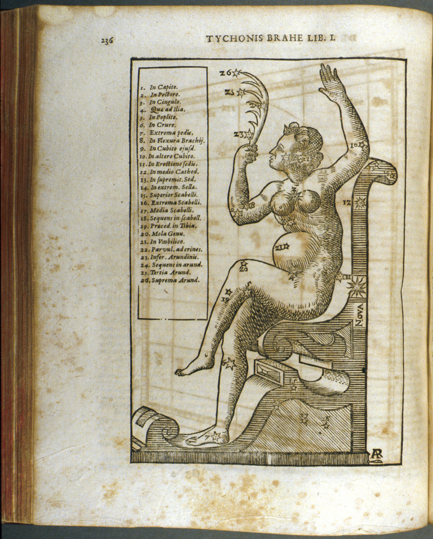 In 1572, something totally unexpected happened: a new star appeared in the constellation of Cassiopeia in early November. In the picture on the left, the new star is the one labeled “NOVA” on Cassiopeia’s chair. It was visible for a couple years and then disappeared. It was actually what we today would call a supernova, the last explosion of a dying star. Supernovae fade from view after several weeks or months. The supernova of 1572 remained visible until 1574. It was one of only eight historical supernovae visible to the naked eye. For Europeans in 1572, this unprecedented object caused serious problems for the accepted Aristotelian view of the heavens. The celestial realm was supposed to be made of one perfect unchanging substance, the ether or quintessence. New objects should not appear and disappear in the celestial realm! Tycho established his reputation as an astronomer with his observations of this new star.