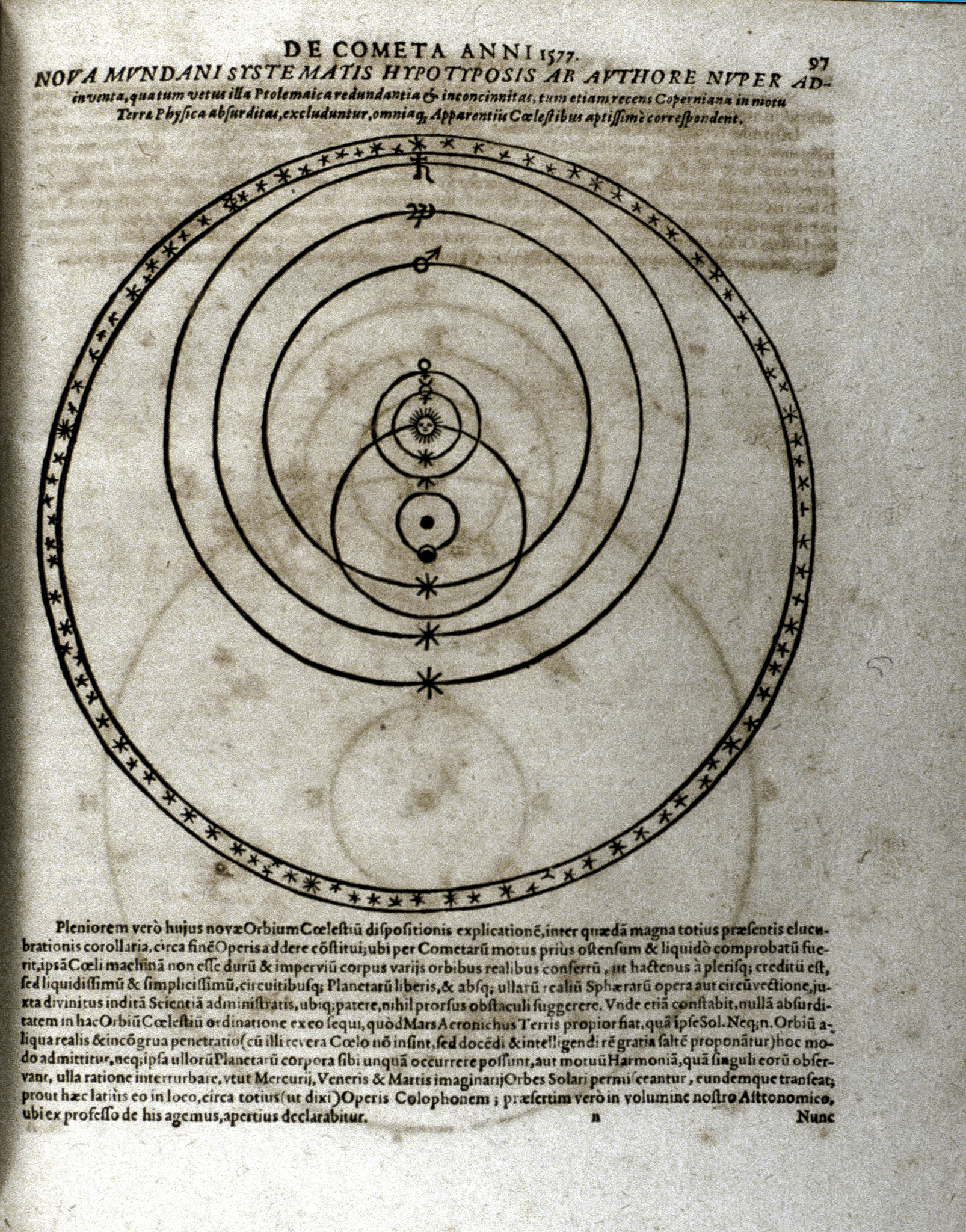 In 1577, Tycho made another set of observations that challenged Aristotelian cosmology. He observed a comet. Now comets were unusual and unpredictable objects, but they were certainly not unheard of. Observations of comets long predated the Greeks. However, because comets were irregular and unpredictable, they were believed to be terrestrial phenomena. From Aristotle on, the standard explanation of comets was that they were meteorological phenomena, like storms. They occurred at the edge of the terrestrial realm in the sphere of fire. They did not occur in the perfect, unchanging, absolutely orderly and regular heavens. However, Tycho’s astronomical instruments enabled him to make more precise measurements of the position of the comet of 1577 than anyone had ever made before. And his observational data proved that the comet was at least six times farther from the earth than the moon. That, of course, put it solidly in the celestial realm, and created another big problem for the Aristotelian view of the cosmos.
