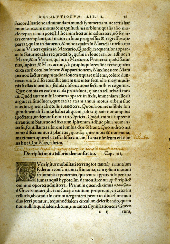 Galileo had already argued that the Copernican system was compatible with the Bible in his Letter to Benedetto Castelli of 1613 and his more famous Letter to the Grand Duchess Christina in 1615. The “Letter to the Grand Duchess” played an important role in the Catholic debate over this issue. In the end, however, despite the vigorous advocacy of Galileo and several other Italian Catholic astronomers and philosophers, the Catholic Church (more specifically, a committee appointed by the Roman Inquisition to decide whether the Copernican system was or was not heretical) rejected the argument for a non-literal reading of the Bible and, in 1616, placed Copernicus’ On the revolutions on the Index of Prohibited Books. It was placed on the Index “until corrected,” which meant that it was still legal for Catholics to own, read and even teach the book as long as a few offending passages were crossed out. These passages were ones that asserted that the earth moves. The mathematical models could still be used to make calculations useful for astrology and navigation. Galileo himself was personally cautioned not to assert the physical reality of the Copernican system in his teaching or writing. The image below is a page from the copy of Copernicus’ On the revolutions held by the History of Science Collections at OU. Like many sixteenth-century copies once owned by Catholics, this copy has corrections. In this case, the phrase De triplici motu telluris demonstratio (On the demonstration of the triple motion of the earth) has been replaced with the handwritten De hypothese triplicis motus terre, et eius demonstratione (on the hypothesis of the triple motion of the earth and its demonstration). In some copies, the offending line has been completely blacked out and replaced with the corrected line. But in this copy, the owner underlined the offending passage, but did not obliterate it.