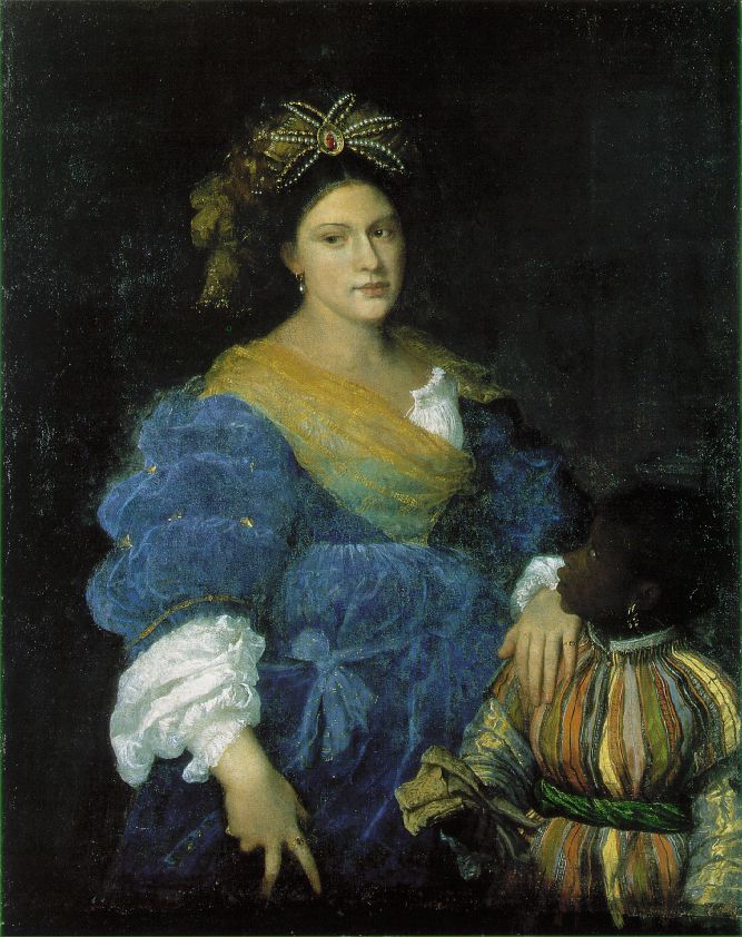 Here is another example, this time from Italy. This is a portrait of Laura Dianti (1480 – 1573), mistress of Alfonso, Duke of Ferrara, by the Italian painter Titian (ca. 1488/1490 – 1576). The boy is simply identified as her “page.”