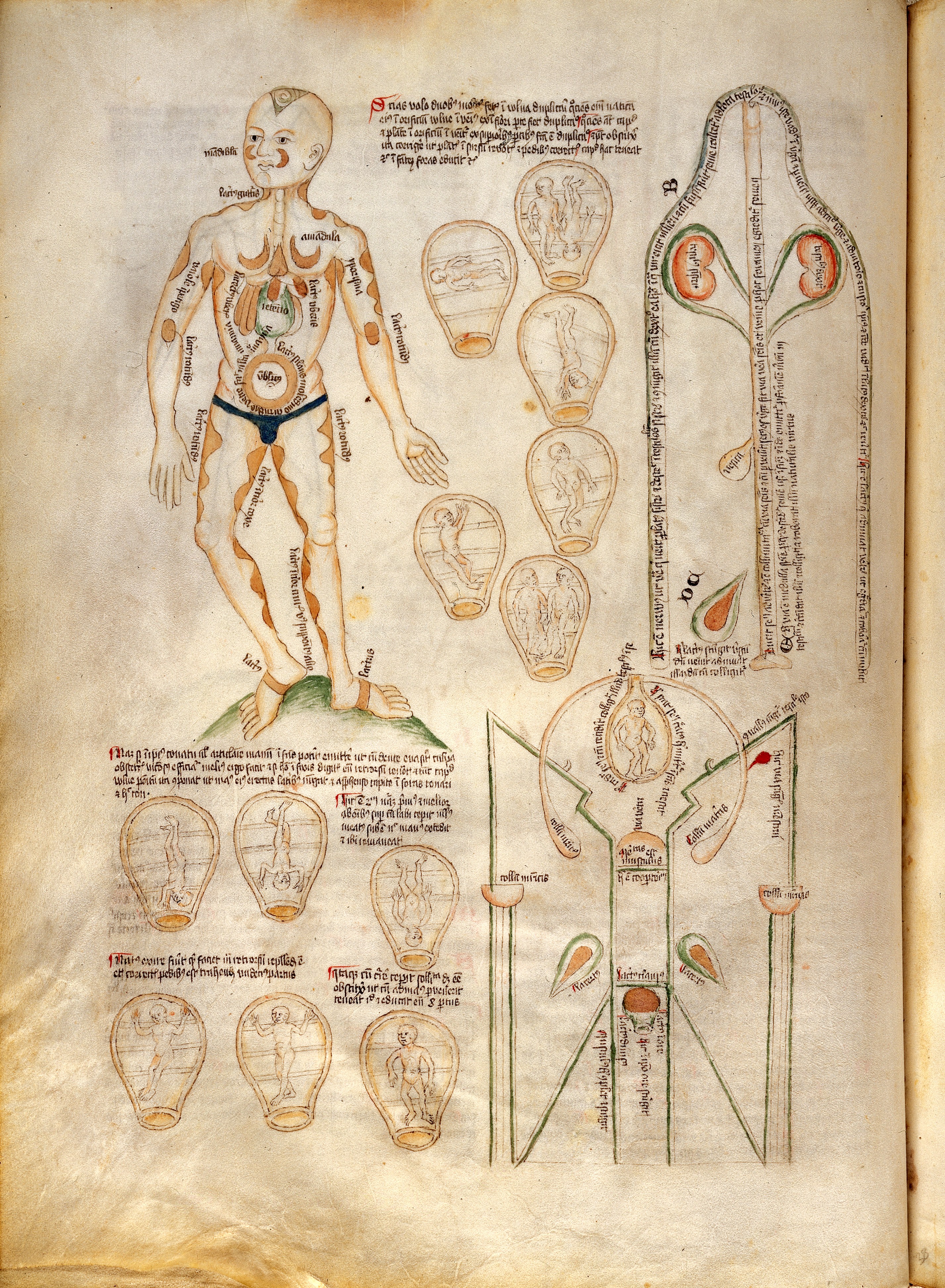 Katharine Park argues that one of the driving forces behind the rising interest in anatomy in fourteenth-century Italy was interest in the female body and particularly in the processes of procreation that went on inside the uterus. Interest in reproduction had multiple causes. Aristocratic Italian families were deeply concerned to produce heirs to continue family lines, especially in the wake of population losses from the plague epidemic of the mid-fourteenth century. Increasingly such families turned to university-educated physicians for help with infertility and pre- and post-natal care, rather than turning to female healers as they might have in the past. In addition to the eminently practical concern about producing bouncing baby boys, the context of late medieval Christianity was important as well. One of the central mysteries of Christianity is the Incarnation, when Christ took human form in the womb of his mother. In a period in which the cult of the Virgin Mary was at its height, studying what went on inside the uterus had powerful theological as well as practical relevance. Park asserts that for late medieval anatomists, the “uterus was the exemplary object of anatomy, the ideal type of the organ whose truth could be plumbed only by opening up the body.” (p. 106) Both Gabriele Zerbi and Berengario da Carpi included extensive sections on the anatomy of the uterus and the formation of the fetus in their anatomical works. In his manuscript notes, Leonardo da Vinci describes a book he planned to write on human anatomy which was to begin with an account of generation.