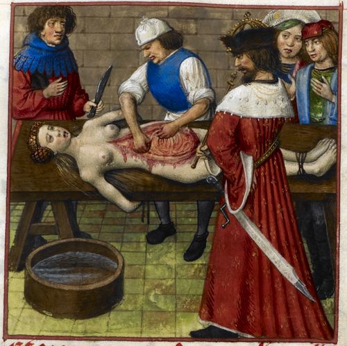 Christians, by contrast, developed a very different set of attitudes toward and associations with dead bodies. Although Christians believed that the whole human being, both body and soul, would be resurrected at the end of time and either cast into the fires of hell or taken up into the joys of heaven, this did not mean that bodily integrity after death was important. In fact, in the early centuries of Christianity, theologians debated the question of what would happen if a person lost an arm or a leg in life or if there body was eaten by wild animals after they died. How could they be resurrected if their body was not intact? The answer to this question, which became the official position of the church, was that God would reassemble all the pieces of the body at the resurrection, no matter how widely they had been dispersed. This meant that there were certainly no objections from the medieval church to practices like embalming, which required partial dismemberment of the body, or to burying different parts of a body in different locations, a not uncommon practice when a person died far from home. Further, the Christian practice of venerating the bodies of saints meant that dead bodies could be seen as holy and as possessing miraculous power, rather than as sources of danger or pollution. By the thirteenth century, autopsies to determine cause of death were being performed, often at the request of the family. For example, in the fifteenth century, Bernard Tornius (1452-1497), a professor of medicine at Pisa, autopsied a young boy at the request of his father. The autopsy report is in the form of a letter to the boy’s father, which begins: “I grieve over thy sad lot, for to lose one’s offspring is hard, harder to lose a son, and hardest [to lose him] by a disease not yet fully understood by doctors.” “But,” Tornius continues, “for the sake of the other children, I think that to have seen his internal organs will be of the greatest utility.” The letter concludes with a series of recommendations for preventive medicines to be given to the deceased child’s sibling so that they may avoid the same illness that carried off their brother.